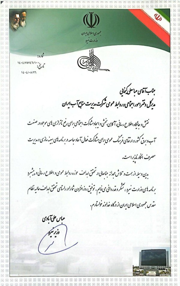 وزیر نیرو از تلاش‌ها و اقدامات مدیرکل دفتر امور اجتماعی و روابط عمومی شرکت مدیریت منابع آب ایران در حوزه اطلاع‌رسانی، آگاهی‌بخشی و جلب مشارکت اجتماعی در امر مدیریت ناترازی‌ها در صنعت آب و برق قدردانی کرد.